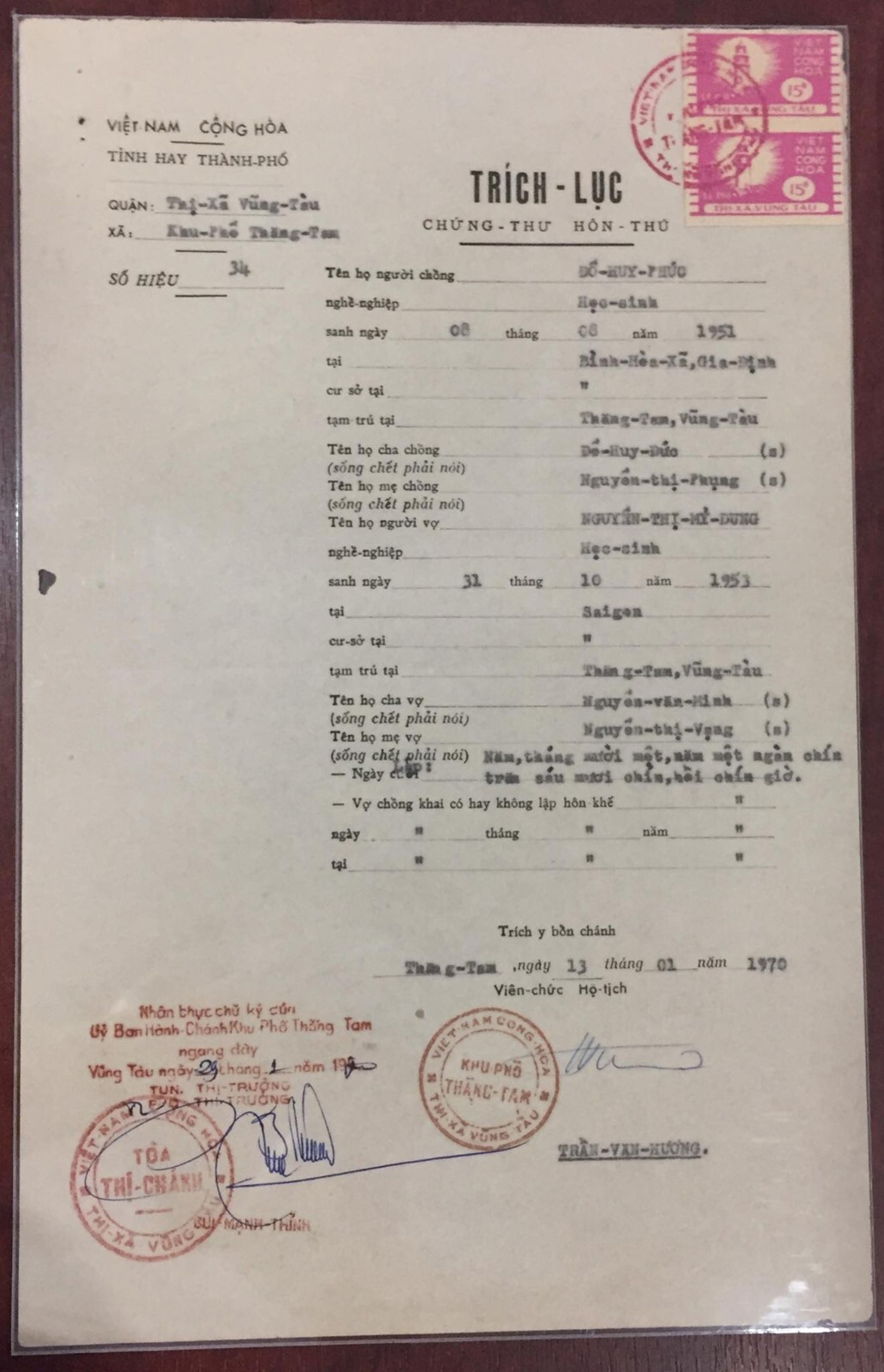 Giấy TRÍCH-LỤC CHỨNG-THƠ HÔN-THÚ tại Thị Xã Vũng Tàu, Thị Xã trực thuộc Trung Ương.